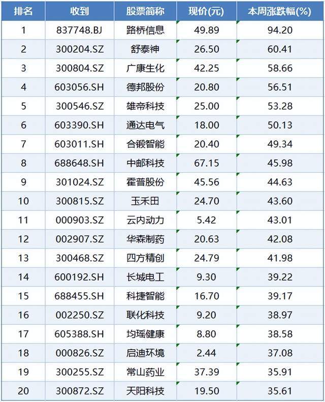 个股方面,本周个股涨幅榜前五位分别是路桥信息、舒泰神、广康生化、德邦股份、雄帝科技,累计涨幅分别为94.20%、60.41%、58.66%、56.51%、53.28%。