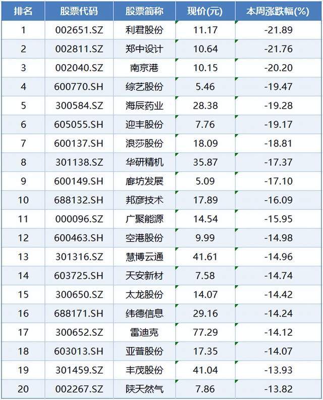 本周个股跌幅榜前五位分别是利君股份、郑中设计、南京港、综艺股份、海辰药业,累计跌幅分别为21.89%、21.76%、20.20%、19.47%、19.28%。