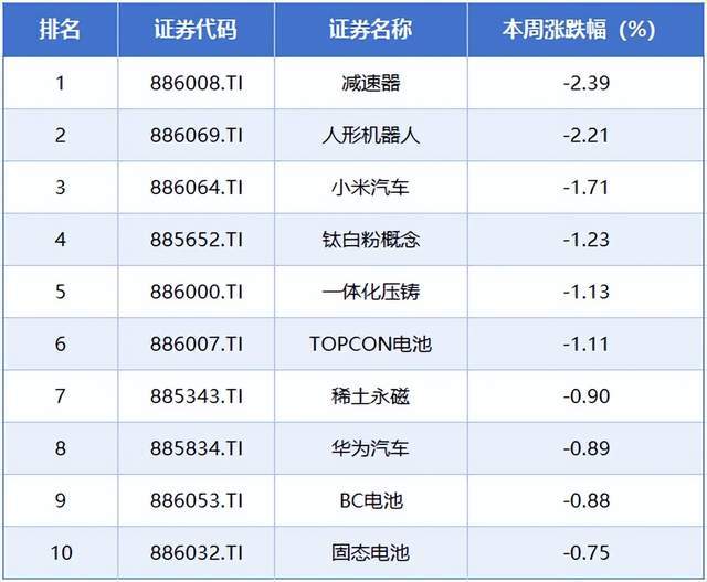 本周排在跌幅榜前排的概念板块分别是减速器、人形机器人、小米汽车、钛白粉、一体化压铸等概念,累计跌幅分别为2.39%、2.21%、1.71%、1.23%、1.13%。