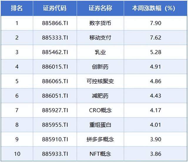 板块方面,本周涨幅居前的概念板块分别是数字货币、移动支付、乳业、创新药、可控核聚变等概念,累计涨幅分别为7.90%、7.62%、5.28%、4.91%、4.86%。
