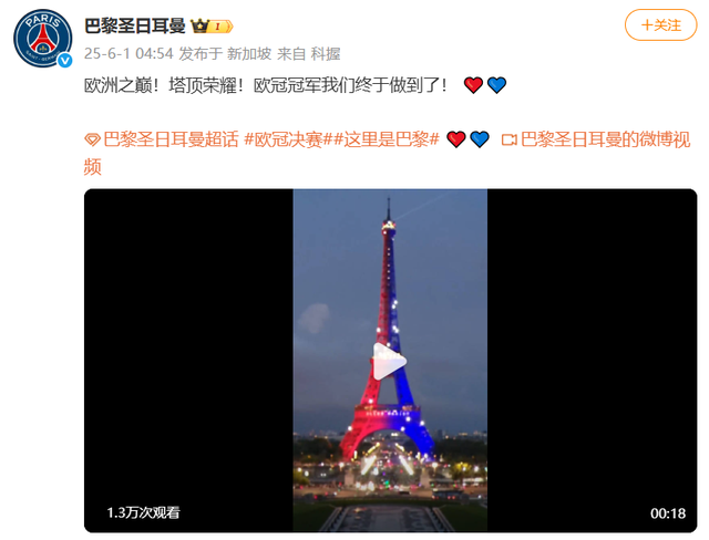 赛后,@巴黎圣日耳曼 发文:“欧洲之巅!塔顶荣耀!欧冠冠军我们终于做到了!”