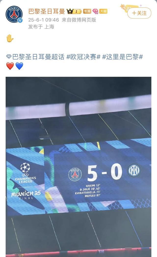 巴黎5比0国米首夺欧冠,内马尔、姆巴佩发文祝贺