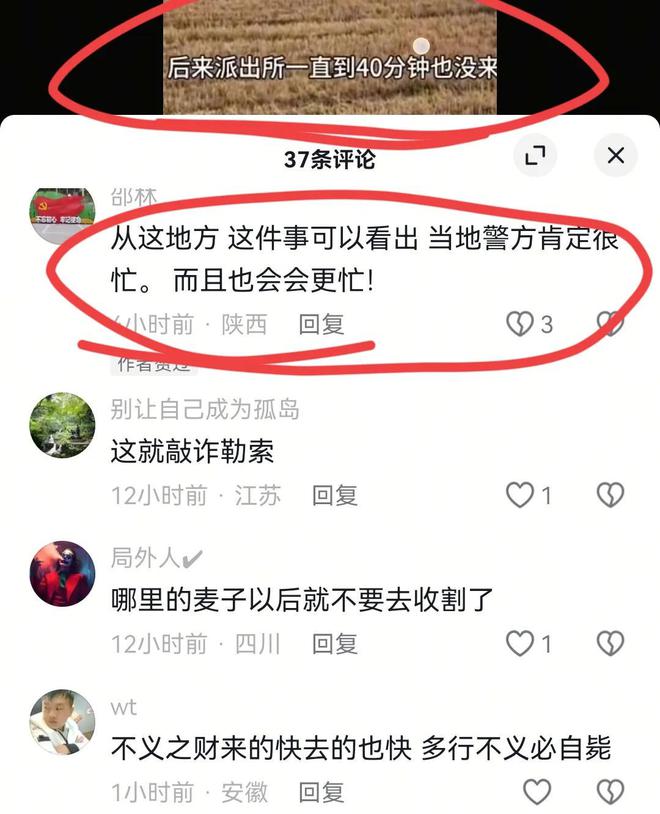 他气的可不只是这500块钱。头一桩,是这瓜农漫天要价太离谱,明明是小事儿,非得整成"天价赔偿";第二桩,是报警之后没人管,维权渠道好像堵死了,只能自己吃哑巴亏。想想也确实憋屈,本来是好心帮忙收麦,结果惹了一肚子气,搁谁身上不得发个文吐槽两句?