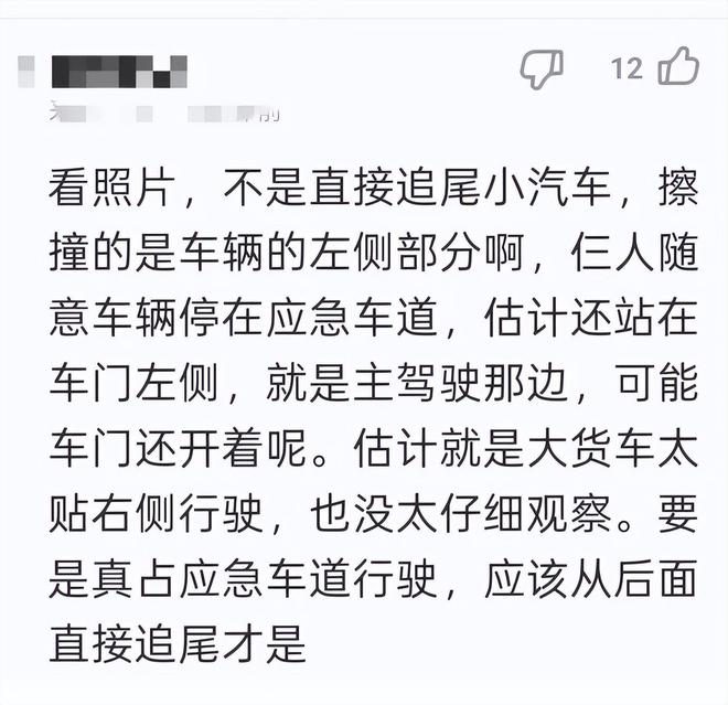 有个网友分析得挺细:“看照片里小车左侧被撞,估计三个人站在主驾驶那边,车门还开着。大货车可能是靠右边太近,没看清前面有人。”这话让不少老司机直点头:“高速上司机视线主要看车道,谁会一直盯着应急车道?人站在那儿跟透明的一样!”