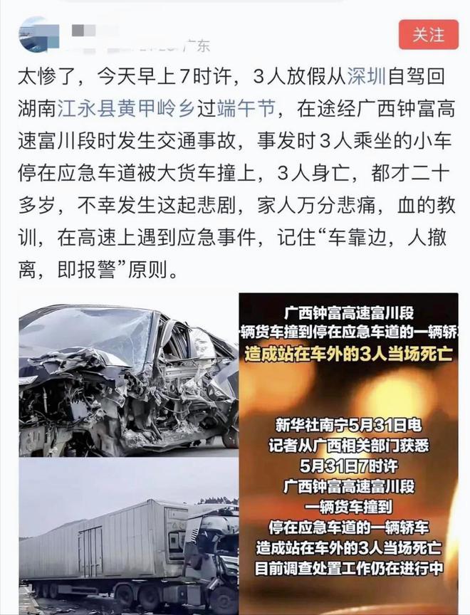 说真的,每次刷到高速车祸新闻都忍不住揪心,可广西钟富高速这事儿,看完现场照片后心里头堵得慌——三个二十来岁的小伙子,开着车回老家过端午,结果在应急车道停了一会儿,人就没了。5月31号早上七点多,正是天亮透的时候,谁能想到这条路会成了生死线呢?