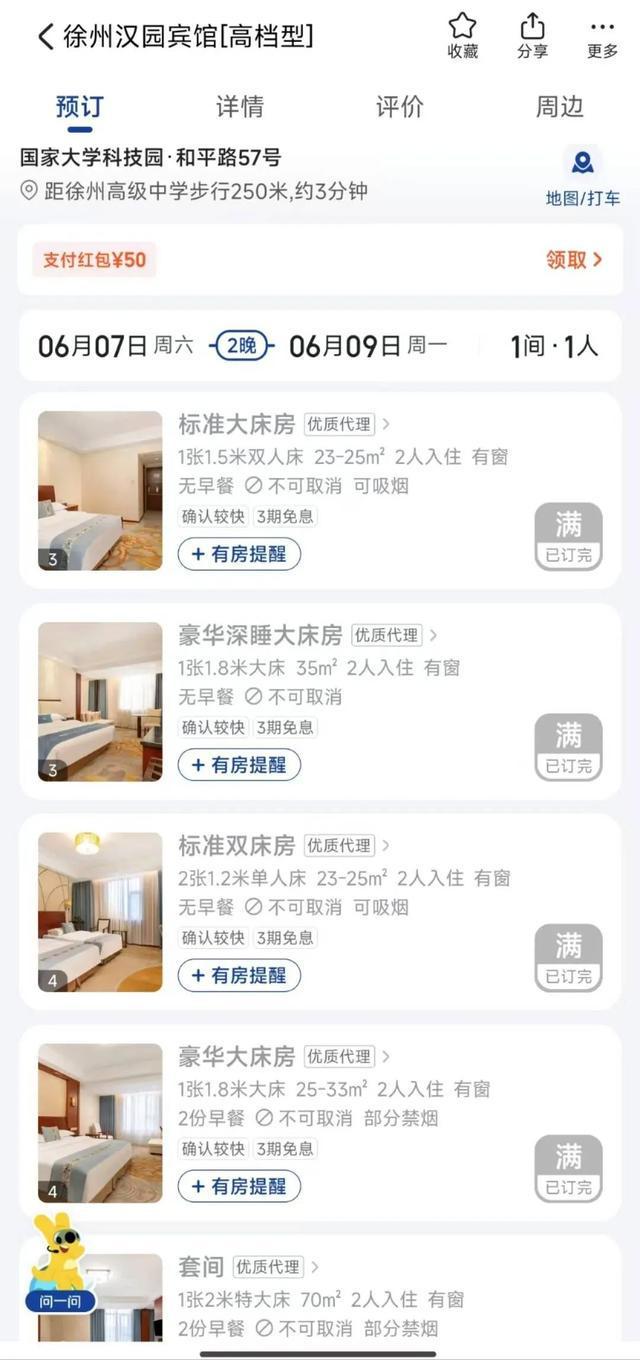 而且一些酒店,甚至连全天房都订满了。距离徐州高级中学较近的徐州汉园宾馆,6月7日至6月9日的所有房型,已全部订满。
