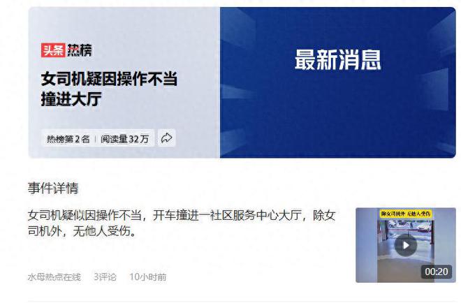 当时社区里已经有工作人员在忙活了,听到响声全吓懵了。有个大姐后来回忆说:“我正低头整理材料呢,就听‘轰隆’一声,一抬头看见车头都伸到大厅里了,吓得我手里的文件夹‘啪’地掉地上,心咚咚直跳,腿都软了。”好在事发早,大厅里人不多,开车的女司机自己打开车门下来,虽说脸色煞白直哆嗦,但看着没受重伤。工作人员赶紧围上去,一边安抚她,一边报警叫保险公司。