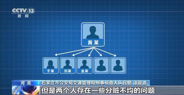 石家庄市公安局交通管理局刑事侦查大队民警 徐迎港:最多分级达到五层,第一层是侯某,第二层冯某,第三层是王某,第四层是于某,他跟黄某虽然是一个团伙,但是两个人存在分赃不均的问题。