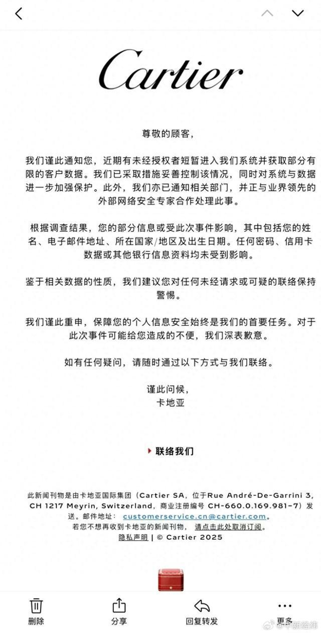 卡地亚回应客户数据泄露:邮件内容属实,已加强保护