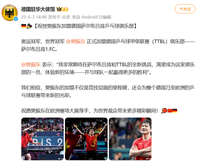 6月3日,德国驻华大使馆发文祝贺樊振东加盟德甲联赛:我们相信,樊振东的加盟不仅是竞技层面的里程碑,还会为整个德国乃至欧洲的乒乓球联赛带来新的光彩。祝愿樊振东在欧洲赛场大展身手,为世界观众带来更多精彩瞬间!