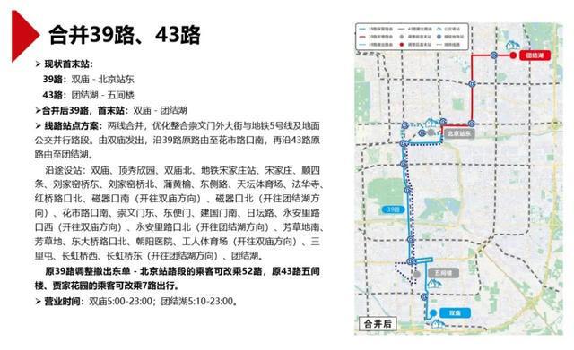 优化整合崇文门外大街与地铁5号线及地面公交并行路段。合并后,线路由双庙发出,沿39路原路线至花市路口南,再沿43路原路线至团结湖。合并后,路号为39路,首末站为双庙—团结湖。原39路调整撤出东单—北京站路段后,乘客可改乘52路;原43路五间楼、贾家花园的乘客可改乘7路出行。