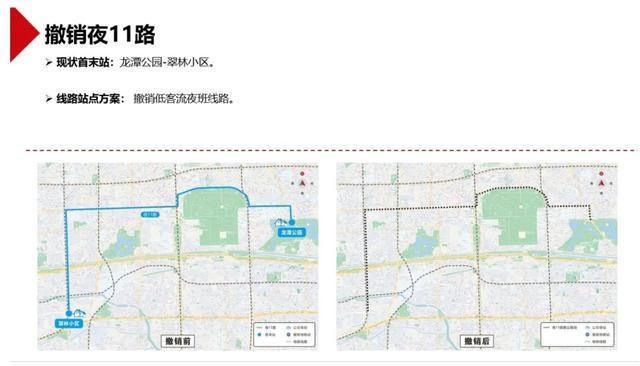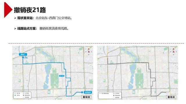 夜21路首末站:北京站东—西直门公交场站;夜11路首末站:龙潭公园—翠林小区。统计数据显示,这两条低客流夜班线路单车次乘客不足2人次。