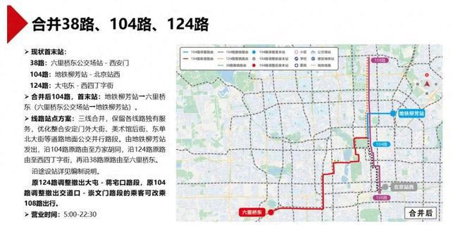 优化整合安定门外大街、美术馆后街、东单北大街等道路地面公交并行路段。合并后,线路由地铁柳芳站发出,沿104路原路线至方家胡同,沿124路原路线至西四丁字街,再沿38路原路线至六里桥东。合并后路号为104路,首末站为地铁柳芳站—六里桥东(六里桥东公交场站—地铁柳芳站)。原124路调整撤出大屯—蒋宅口路段;原104路调整撤出交道口—崇文门路段,沿途乘客可改乘108路出行。