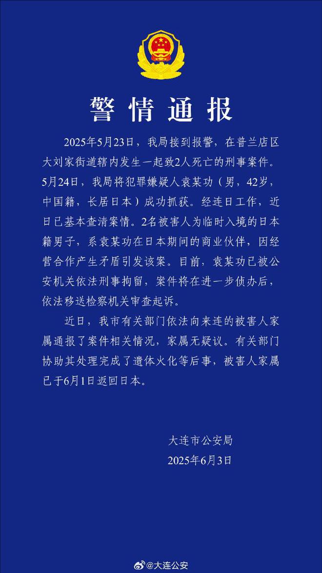 事情的来龙去脉得从5月23日说起。当天警方接到报案后,立刻就展开了调查。据了解,遇害的是两名日本籍男子,临时入境到大连,而嫌疑人袁某功今年42岁,虽然长居日本,但本身是中国籍。更让人唏嘘的是,这两位被害人跟袁某功还是在日本时的商业伙伴,原本一起做生意,没想到因为经营合作上的矛盾,竟然闹到了人命关天的地步。