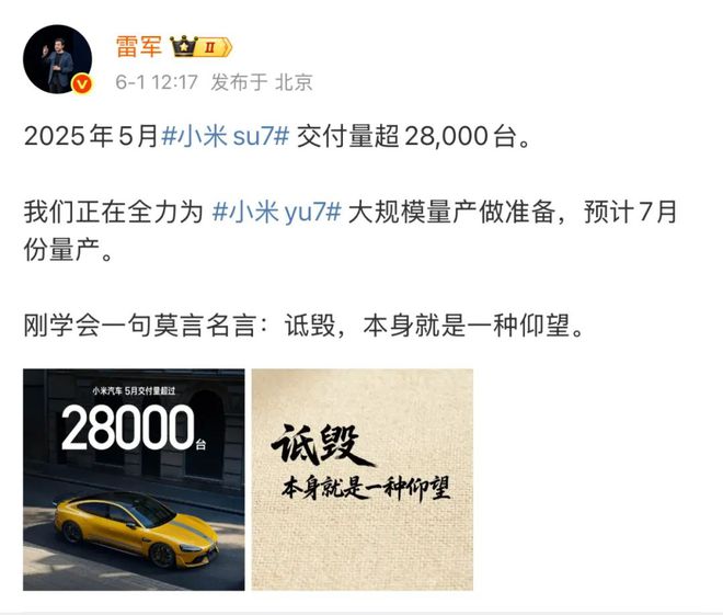 对此,雷军6月1日中午在社交媒体上不仅晒出了亮眼的5月汽车销量,还强调:“诋毁,本身就是一种仰望。”