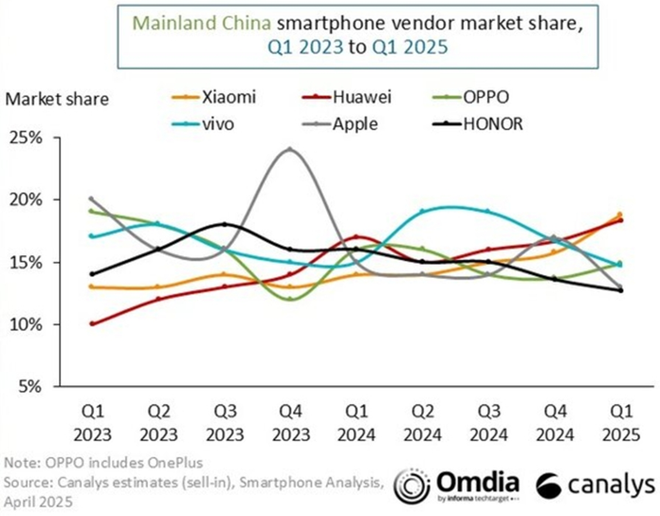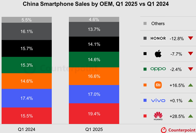 回到小米,它依靠小米15、REDMI Turbo 4 Pro等机型维持市场份额,与华为在旗舰市场的竞争日趋激烈。