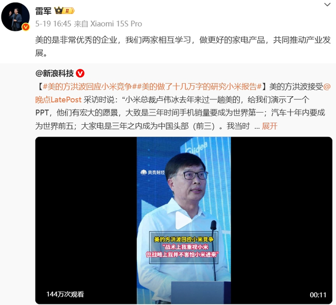 此话一出,雷军也于5月19日在微博上发文回应,称“美的是非常优秀的企业”,强调双方共同推动产业进步。