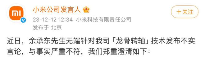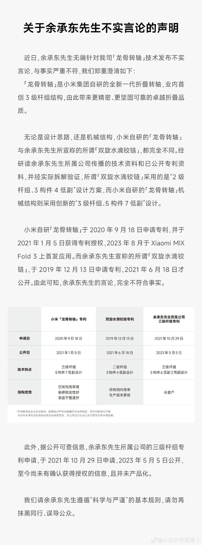 对于这样的发言,小米公司当时发布了一则声明,并表示:“余承东先生无端针对我司‘龙骨转轴’技术发布不实言论,与事实严重不符。”