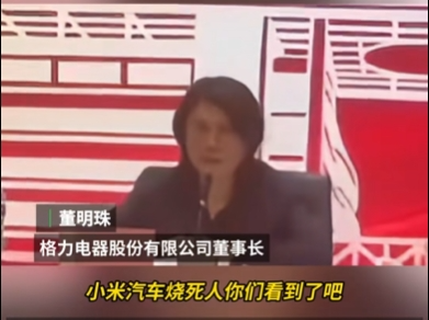 她说:“小米汽车‘烧死人’你们看到了吧,但格力在北京大1路跑了十几年从没有火灾事故,这就是实力,这就是技术。”