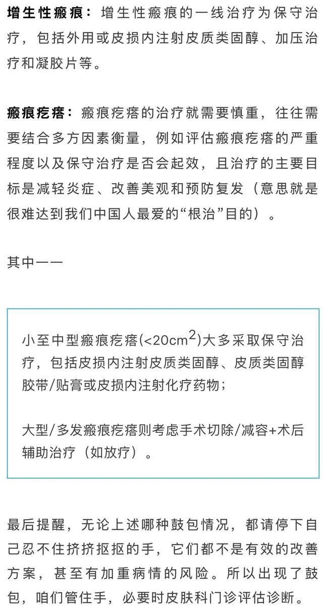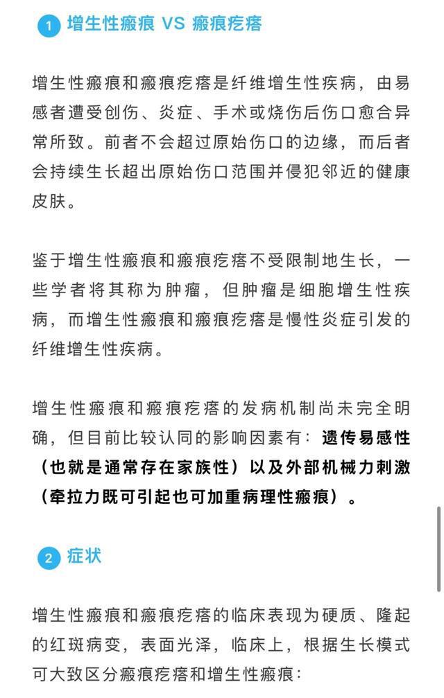 ● 增生性瘢痕终会达到生长平台期,随后通常进入消退期,而瘢痕疙瘩表现为持续生长。