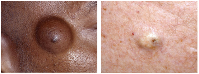● 肤色到蓝灰色的硬丘疹或结节 ;