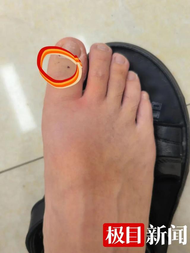 在黄先生提供的图片上记者看到,他躺在病床上,右脚上缠着纱布。还有照片显示,右脚大拇指上有两个明显的小眼。