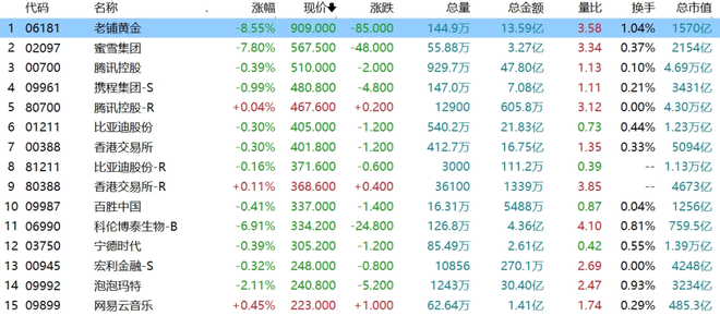 尽管跌破1000港元,但在港股主板上市企业中,老铺黄金以909港元的股价居于首位,远超蜜雪集团和腾讯。