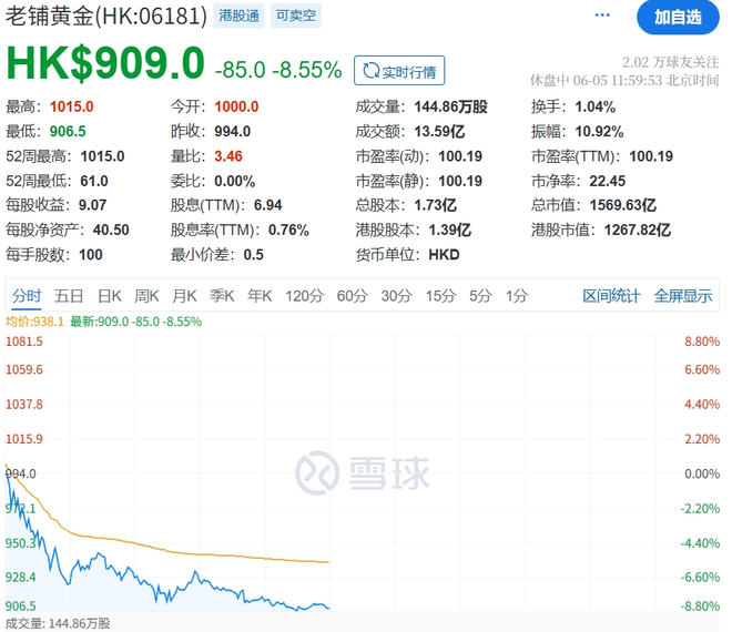 老铺黄金跌破1000港元,不到一年,股价翻了20倍