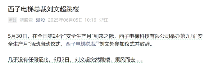 据公众号“浙股君”6月5日消息,6月2日, 西子电梯科技有限公司刘文超突然跳楼,不幸身亡。