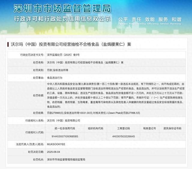 深圳市市场监督管理局行政处罚信息公示,6月4日,沃尔玛(中国)投资有限公司因食品违法行为,被深圳市市场监督管理局福田监管局罚款279965元;没收违法所得10031.00元;对相关责任人Dawn Ptak处罚款27996.5元,涉及经营抽检不合格食品(盐焗腰果仁)案。