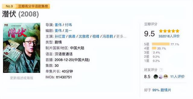 据悉,电视剧版《潜伏》由孙红雷饰余则成,姚晨饰翠平,超33万观众在豆瓣网为该剧打出了9.5分的高分。