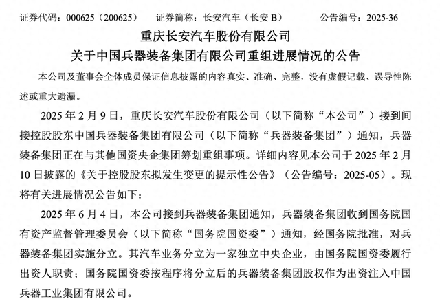长安汽车(000625)公告称,6月4日,公司接到兵器装备集团通知,兵器装备集团收到国务院国资委通知,经国务院批准,对兵器装备集团实施分立。其汽车业务分立为一家独立中央企业,由国务院国资委履行出资人职责;国务院国资委按程序将分立后的兵器装备集团股权作为出资注入中国兵器工业集团有限公司。