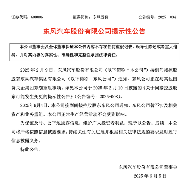 6月5日早间,东风股份(600006)、东风科技(600081)公告称,2025年2月9日,公司接到间接控股股东东风公司通知,东风公司正在与其他国资央企集团筹划重组事项。2025年6月4日,公司接到间接控股股东东风公司通知,东风公司暂不涉及相关资产和业务重组。公司正常生产经营活动不会受到影响。