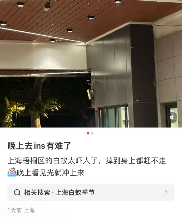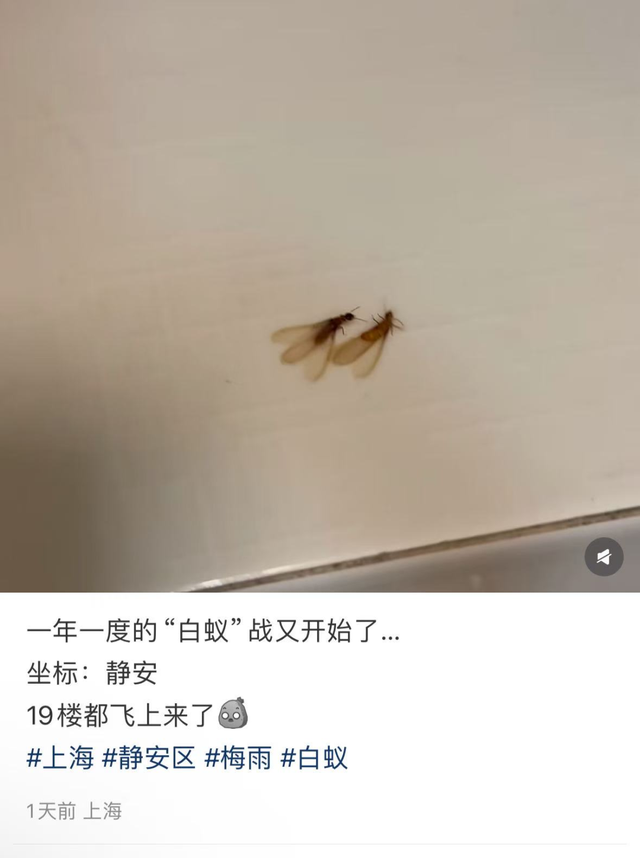 目前,上海已进入白蚁出飞的高峰期,如果市民碰到也不必惊慌。白蚁出飞的主要目的是寻觅配偶,它们飞离巢穴后,凭借与生俱来的趋光特性,雄蚁会紧紧追逐雌蚁,并在合适之处完成交配,进而建立新的蚁巢。这便是我们常在路灯下、广告牌周边看到大量白蚁聚集的缘由。