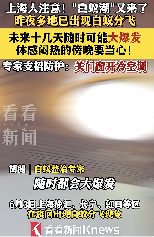 专家提醒,近期市民若在傍晚时分感到体感闷热,就该做好针对白蚁分飞的防护准备,包括关闭门窗、打开冷空调除湿等措施。