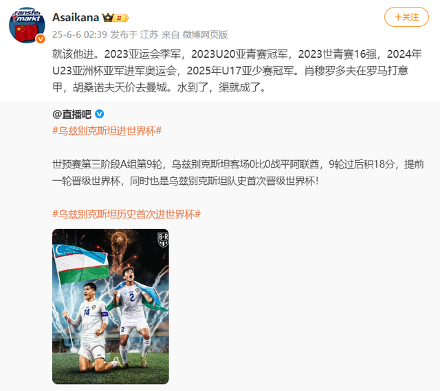 知名体育博主、德转市场网站中国区管理员@Asaikana 在个人微博评价道:就该他进。2023亚运会季军,2023U20亚青赛冠军,2023世青赛16强,2024年U23亚洲杯亚军进军奥运会,2025年U17亚少赛冠军。肖穆罗多夫在罗马打意甲,胡桑诺夫天价去曼城。水到了,渠就成了。