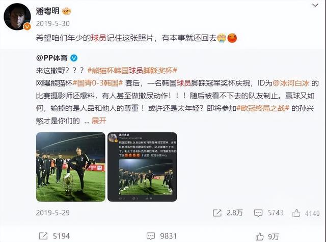 潘粤明也忍不住怒斥了韩国球员的行为:“希望咱们年少的球员记住这张照片,有本事就还回去。”