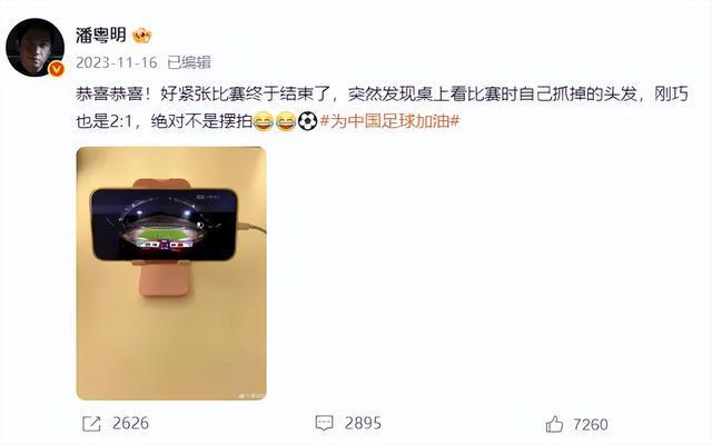 2023年11月16日,他晒出观看国足与泰国队比赛的照片,为中国足球加油。
