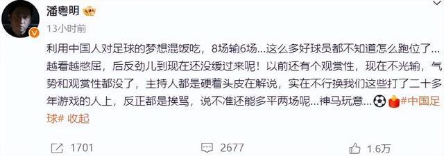 这并非是潘粤明第一次发文谈国足,3月26日晚,潘粤明就曾发文谈“国足8场6败”,引发网友热议,相关话题词冲上热搜榜。
