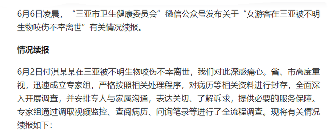 旅行中最令人心惊的,莫过于当生命遭遇不可预知的威胁时,却在专业体系中找不到可靠的支撑。近日,三亚女游客被不明生物咬伤身亡事件持续发酵,而海南卫健委续报中“患者自诉,未提及被蛇咬伤”这一表述,如同导火索般点燃了舆论场。这句话不仅暴露了医疗处置的漏洞,更引发了公众对专业体系信任的崩塌。