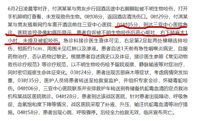 6月6日凌晨,三亚市卫健委就女子被蛇咬伤去世再通报(续报),在通报中强调“患者自诉,未提及被蛇咬伤”,试图以此解释首诊医生未按毒蛇咬伤处置的原因。这一表述迅速成为舆论焦点,网友“富足青山1s”尖锐指出:“两个齿印相距1厘米,舌头有麻木,一个农民都怀疑是蛇咬,急诊科医生一点常识都没有”。这种质疑并非空穴来风——根据通报,患者抵达医院时已出现右下肢麻木、恶心呕吐等典型中毒症状,右足第二趾两处相距1厘米的齿痕更符合毒蛇咬伤特征。在医学常识中,毒蛇咬伤的典型表现包括局部齿痕、神经毒性症状(如麻木、呼吸抑制)等,这些特征在患者身上已十分明显。