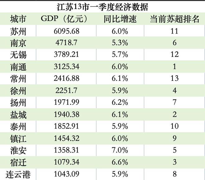 江苏“十三太保”一季度经济数据和“苏超”三轮比赛后排名(数据来源:各地统计局及江苏省体育局;制表:时代周报/王晨婷)