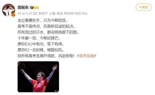 6月5日,樊振东在个人微博发文,为高考生送祝福。