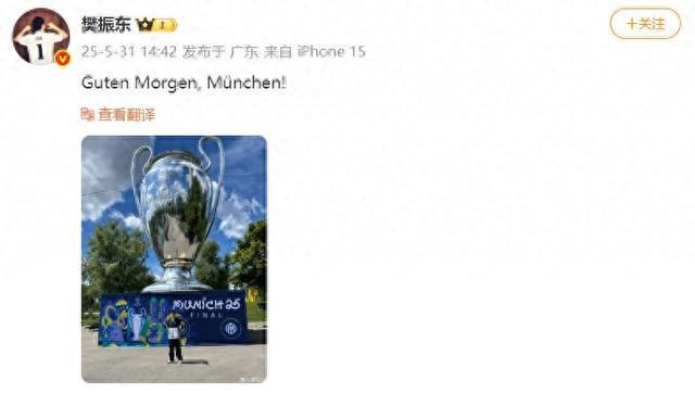 5月31日,樊振东曾在个人微博晒照去德国慕尼黑观看本赛季欧冠决赛。