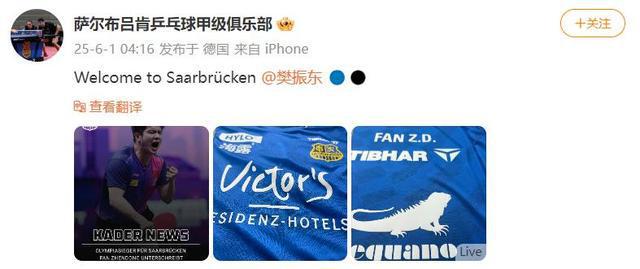 此前,6月1日,德甲萨尔布吕肯俱乐部通过社交媒体宣布中国运动员樊振东加盟该俱乐部,征战2025-2026赛季德国乒乓球甲级联赛和欧洲冠军联赛。