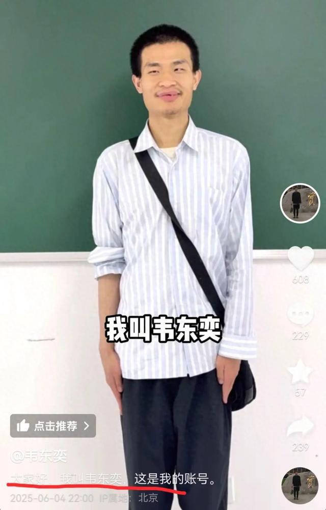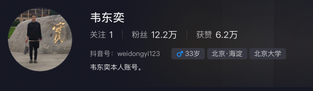 6月6日,有网友在短视频平台发现一账号用户名为韦东奕,用的是真名和真实图像,且在介绍中明确说了是韦东奕本人账号。