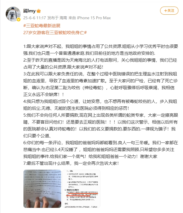近日,三亚27岁女游客被不明物咬伤身亡事件持续发酵。6月6日 ,当事人家属李先生再发文称,大家比较关心的“尸检”,已经有了死亡诊断,确认为右足第二趾为咬伤(神经毒蛇),心脏呼吸骤停后呼吸衰竭。