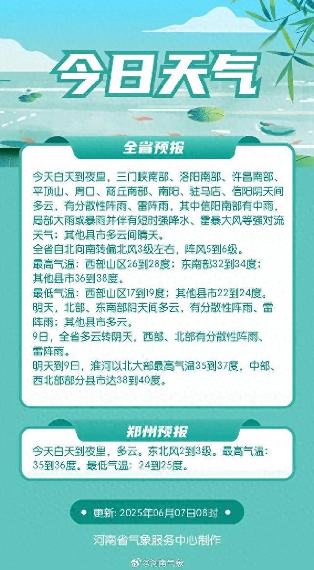 今天白天到夜里,三门峡南部、洛阳南部、许昌南部、平顶山、周口、商丘南部、南阳、驻马店、信阳阴天间多云,有分散性阵雨、雷阵雨,其中信阳南部有中雨,局部大雨或暴雨并伴有短时强降水、雷暴大风等强对流天气;其他县市多云间晴天。