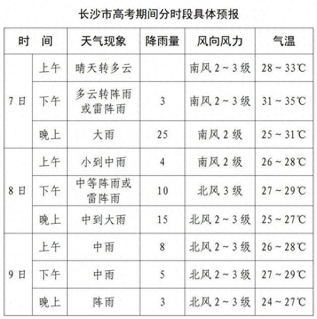 7 日(高考),湘中以北有中到大雨,其中岳阳、湘西州、张家界西部、怀化北部暴雨,单点大暴雨,其他地区多云有阵雨或雷阵雨;雷雨时阵风7~9级;最高气温湘中、湘南33~36℃,其他地30~32℃。