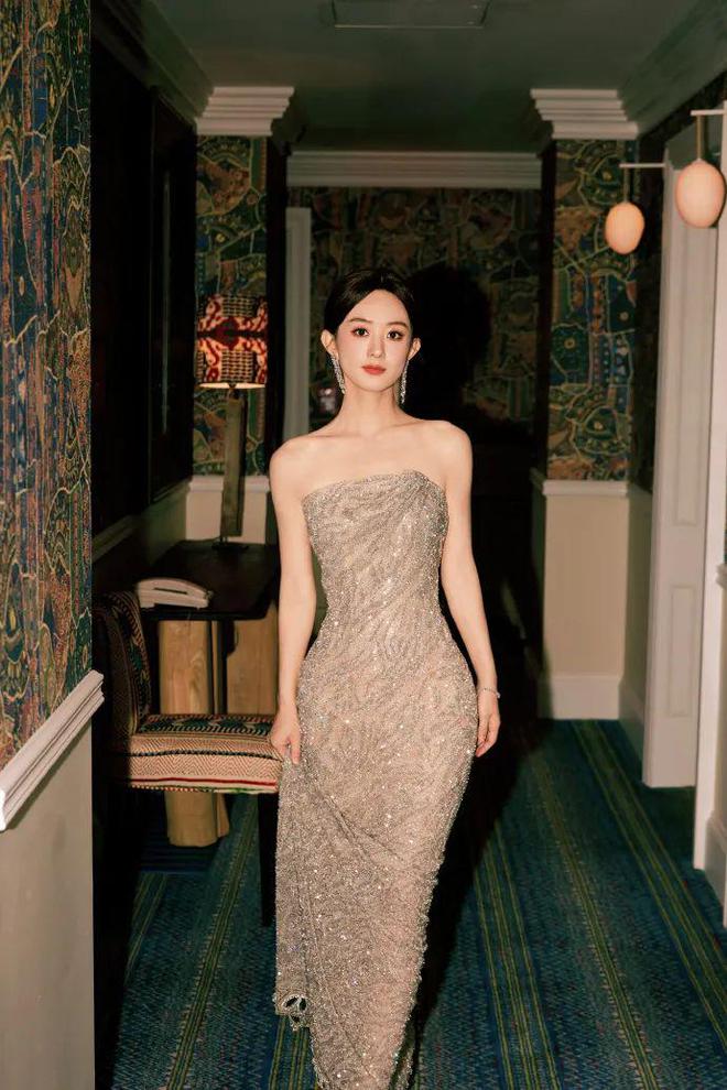 场外赵丽颖身着香槟色抹胸亮片长裙
